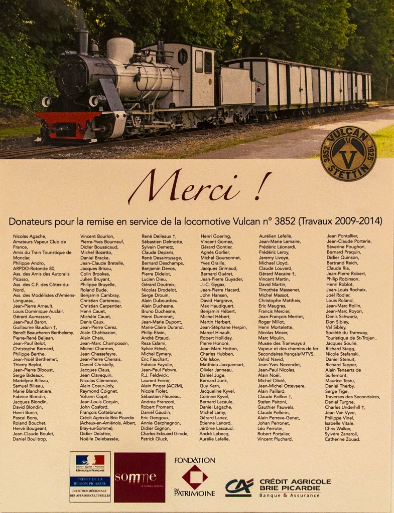 Un mot sur la vulcan : cette locomotive 040 + T, construite en 1925 pour le Mecklenburg Pommersche Schmalspur-bahn situé au nord de l’ex-Allemagne de l’Est, a circulé pendant 20 ans sur les bords de la Somme, elle possède plusieurs équipements plutôt rares sur des locomotives à voie de 60 cm, tels que la surchauffe, une turbo-dynamo, un dispositif de réchauffage de l’eau du tender, des prises de vapeur pour le chauffage des voitures voyageurs, le frein à vapeur. son origine et son parcours lui ont valu d’être classée Monument Historique. Arrêtée en 1978, après 6 années et des milliers d’heures de travaux (bénévoles et salariés), la Vulcan a repris du service durant la saison 2014.