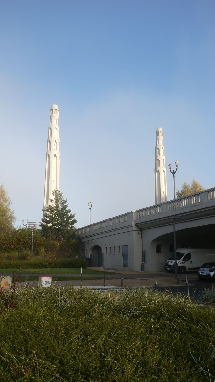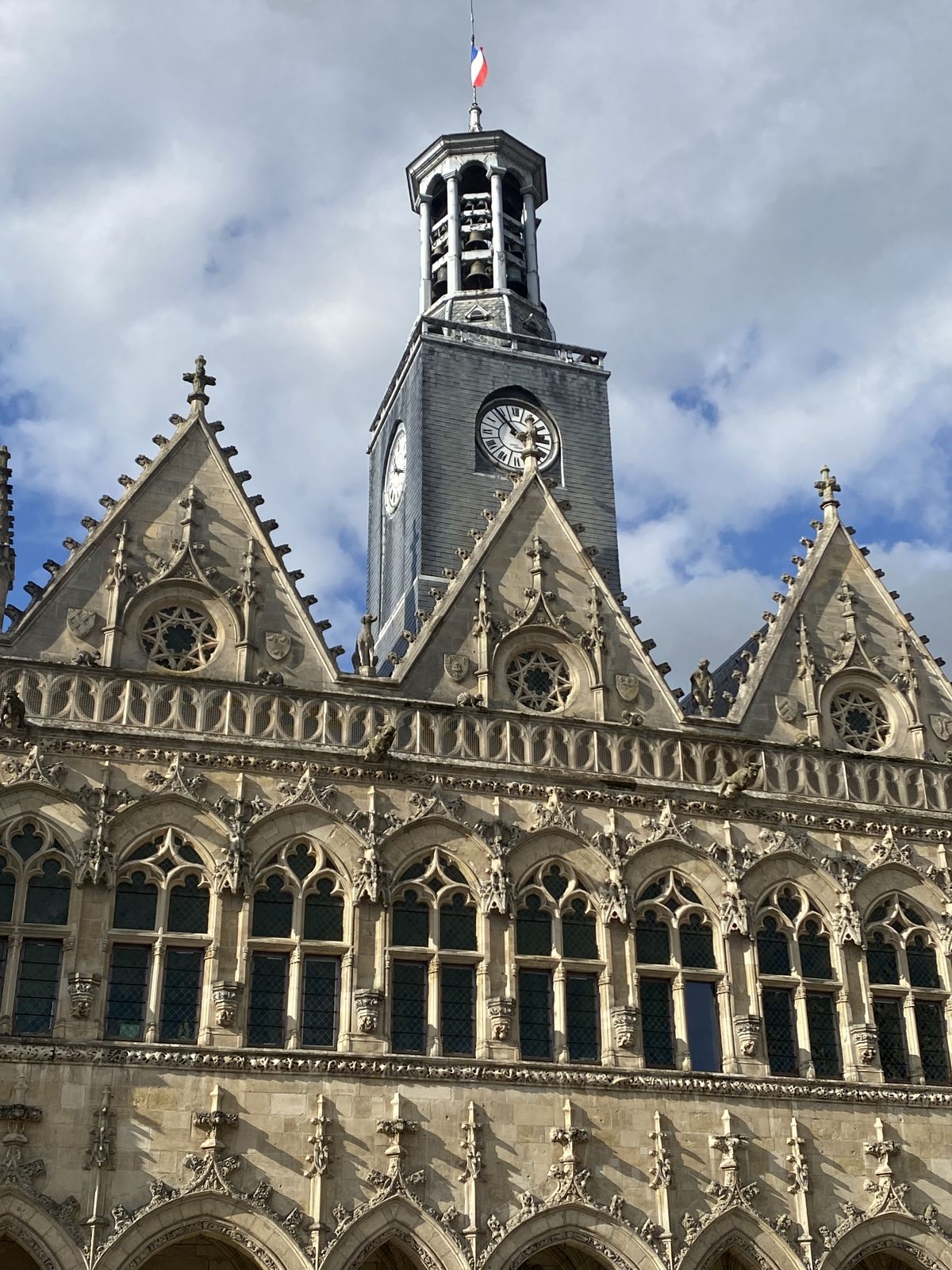 Nous reprenons le car pour emprunter le pont d’Isle avec ses phares. Nous passons devant le Monument aux Morts, le monument au Roi des Belges puis les béguinages (rappel de la richesse industrielle de la ville) avant de nous arrêter sur le parvis de la Basilique avec sa tour porche restaurée aux pierres étincelantes au soleil. Un jardin a remplacé le parking.