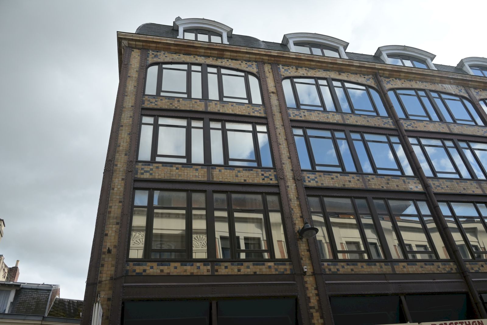 Un ancien bâtiment industriel d’architecture métallique et décoré des céramiques vernissées jaunes, est occupé notamment par la boulangerie Paul et des restaurants.