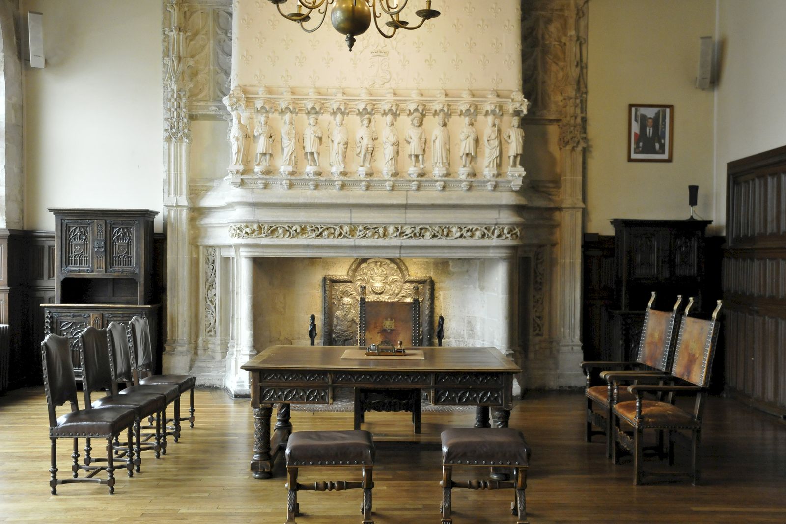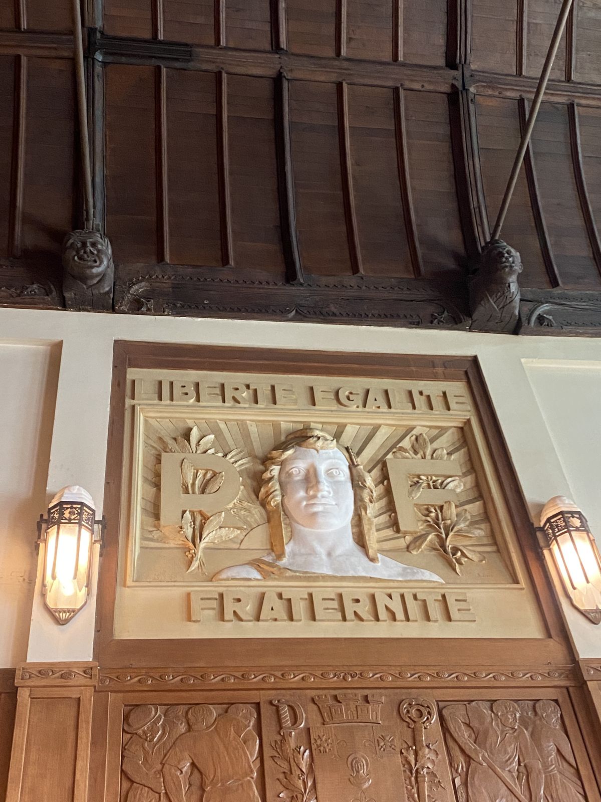 Son architecture gothique abrite une salle du conseil Art déco qui a gardé son plafond gothique en carène à blochets (boiseries, luminaires, lampes de bureau, tribune du premier magistrat sont Art déco) où nous nous asseyons pour écouter le guide qui attire notre attention sur la Marianne placée au-dessus de la tribune, à laquelle le sculpteur a donné les traits d’une femme africaine.