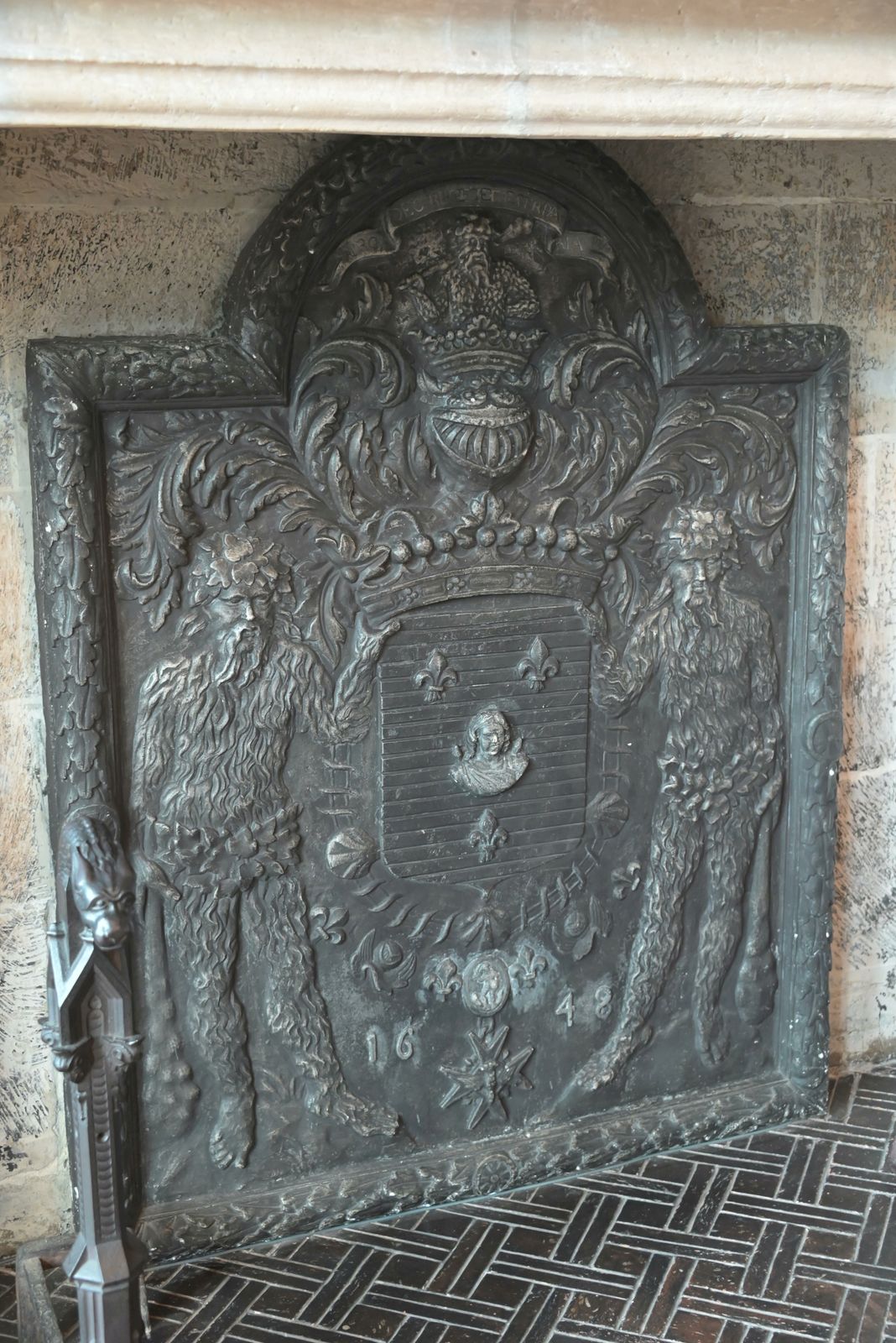Nous gagnons ensuite la salle des mariages à la cheminée gothique, à la plaque d’âtre en fonte, au plafond en carène de bateau comportant des blochets colorés. Un bureau porte le buvard et l’encrier des signatures.