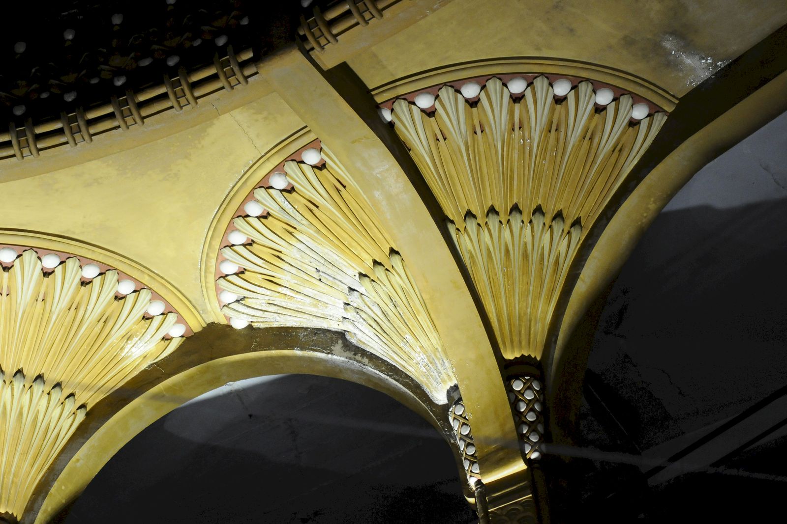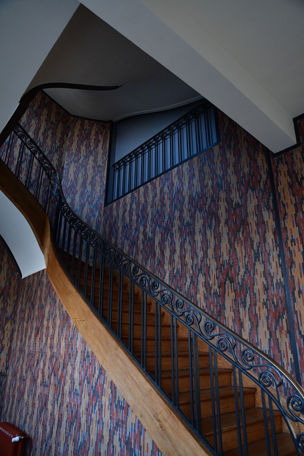 Puis nous retraversons la grand place et nous dirigeons vers le Palais de l’Art déco dont l’entrée est commune avec le musée des Papillons. En l’absence d’exposition, l’éclairage faible permet de deviner les corolles des piliers staffées et dorées, l’escalier monumental et sa rampe, les étages en mezzanine sous la verrière ovale.