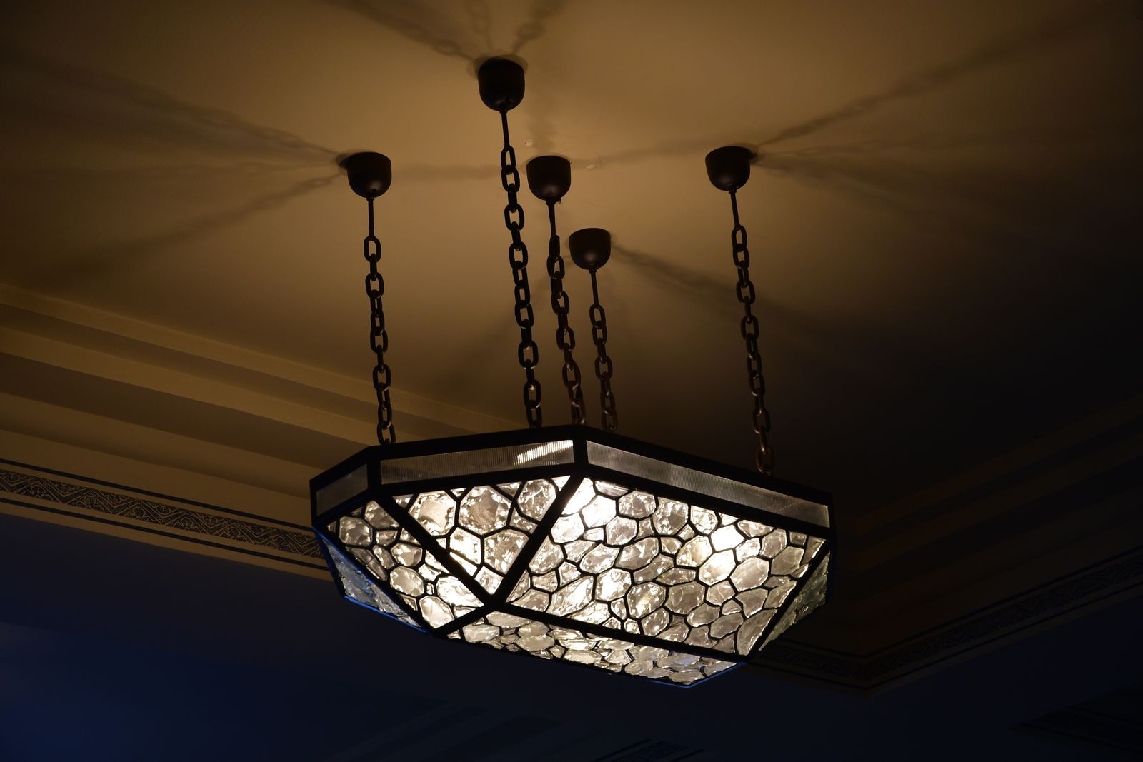 Le décor utilise la rose mais sous une forme stylisée. Il fait emploi de verres (il y en a dix variétés). Sur les parois du buffet, des émaux grisés avec insertion de cubes d’or massif. La marquetterie très présente utilise la palissandre du Brésil et des bois résistants et malléables.