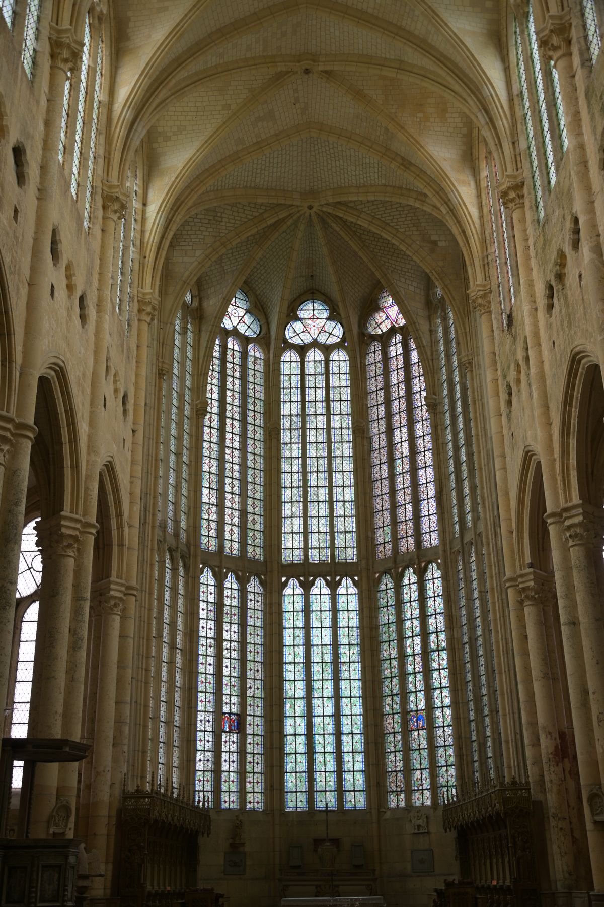 L’importance de la surface vitrée explique la luminosité, puisque l’abside possède sept hautes baies vitrées (21,50 m) qui reposent sur un mur plein d’à peine trois mètres de haut.
