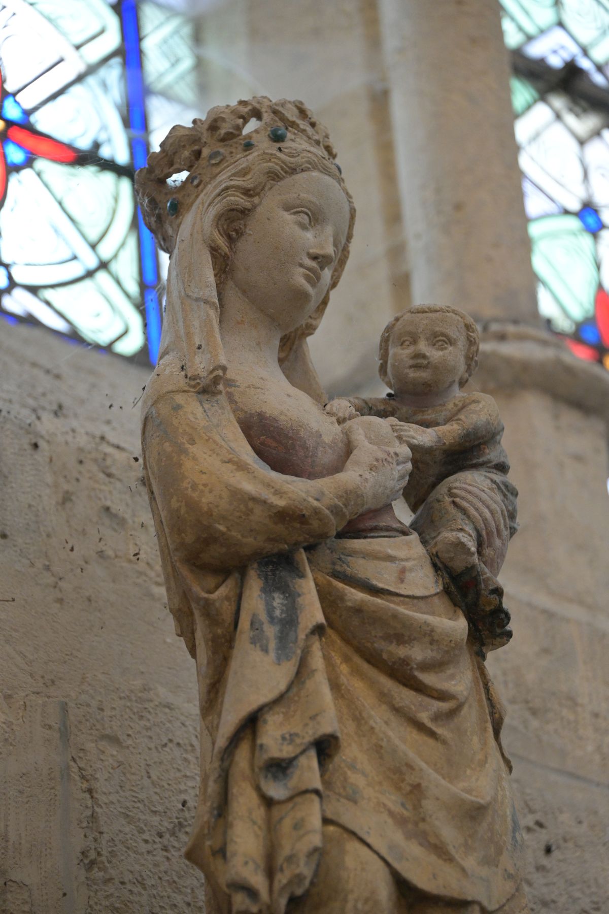Une deuxième statue de la Vierge à l’Enfant, plus petite – 80 cm de haut – , posée sur un socle accroché au mur (côté gauche) du chevet, peut être datée (d’après son style) des années 1360-1380. Elle est en pierre calcaire. Quelques boucles de cheveux sortent du voile, sous la couronne qui porte encore quelques cabochons de pâte de verre de couleur.