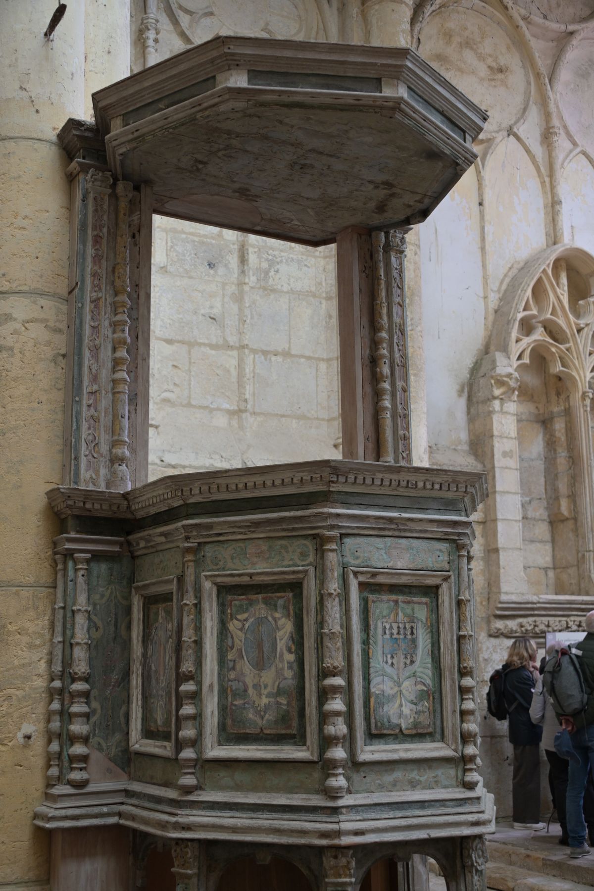 La chaire est en bois polychrome et montre les « armes » de l’abbaye (« d’hermine à la fasce d’azur chargée de trois fleurs de lis d’or ») et un cœur percé d’une flèche, évoquant Saint Augustin, dont les chanoines suivaient la règle.