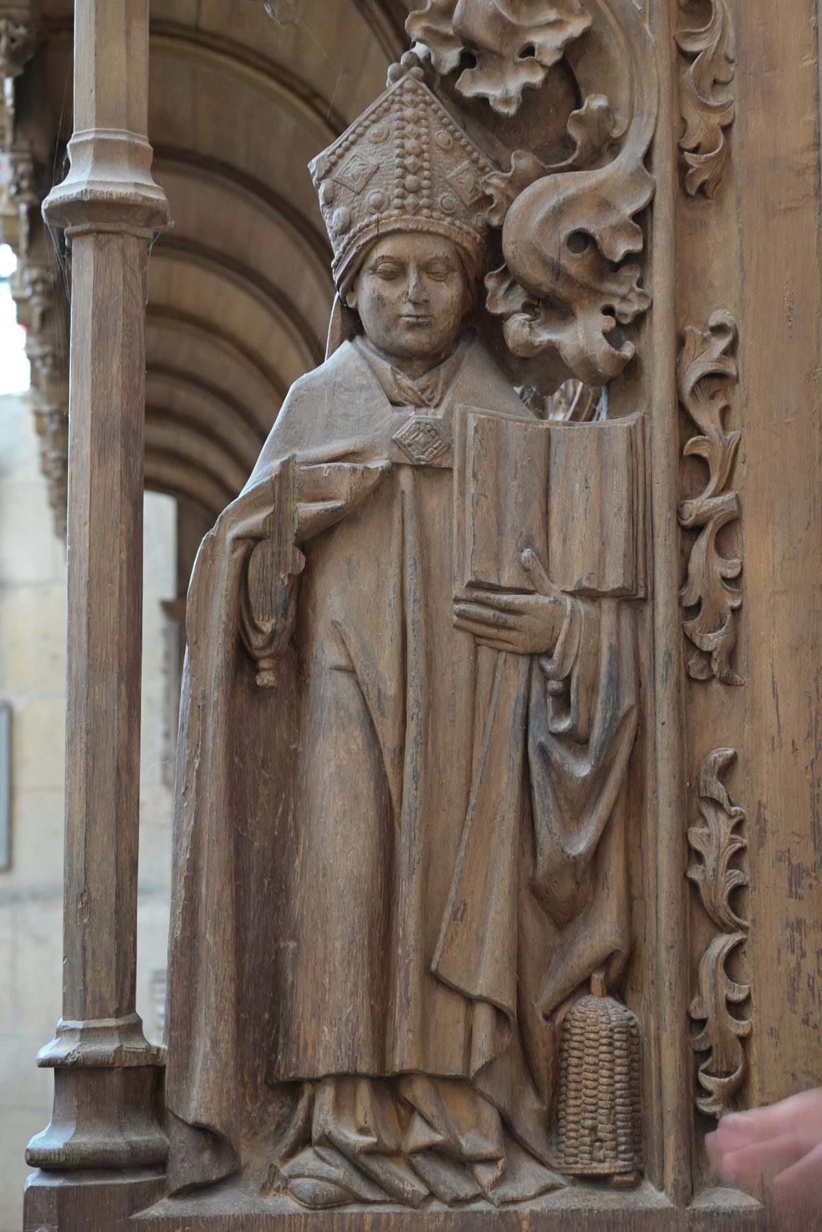 Les stalles hautes possèdent encore leurs hauts dossiers surmontés d’un baldaquin en arc de cercle. Les rangées sont terminées par les jouées hautes. Elles montrent des scènes et des personnages religieux. Les miséricordes et les appuie-mains sont sculptés de scènes de la vie quotidienne, de personnages, de monstres, d’animaux, mêlant éléments concrets et imaginaires, d’illustrations de proverbes ou de dictons : « Il est temps de fermer l’étable quand le cheval est perdu » ; « Tant vaut un homme riche entre deux avocats comme une poule entre deux renards ».