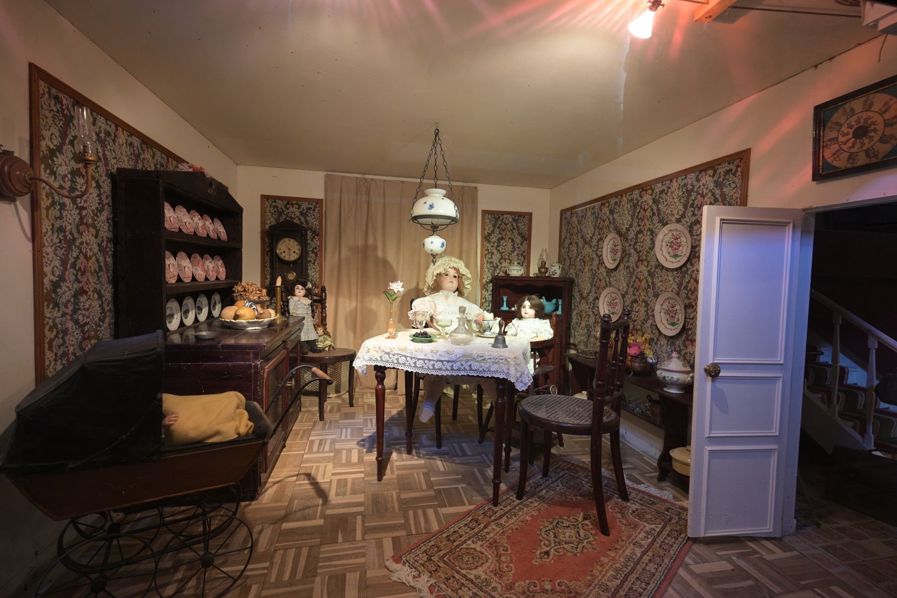 C’est à la demande d’un grand collectionneur, aujourd’hui disparu, Jac Remise, que cette maison large de plus de 7 mètres et haute de près de 4 mètres, a vu le jour. Il a rassemblé plus de 1200 objets divers pour mettre en scène sa douzaine de poupées.