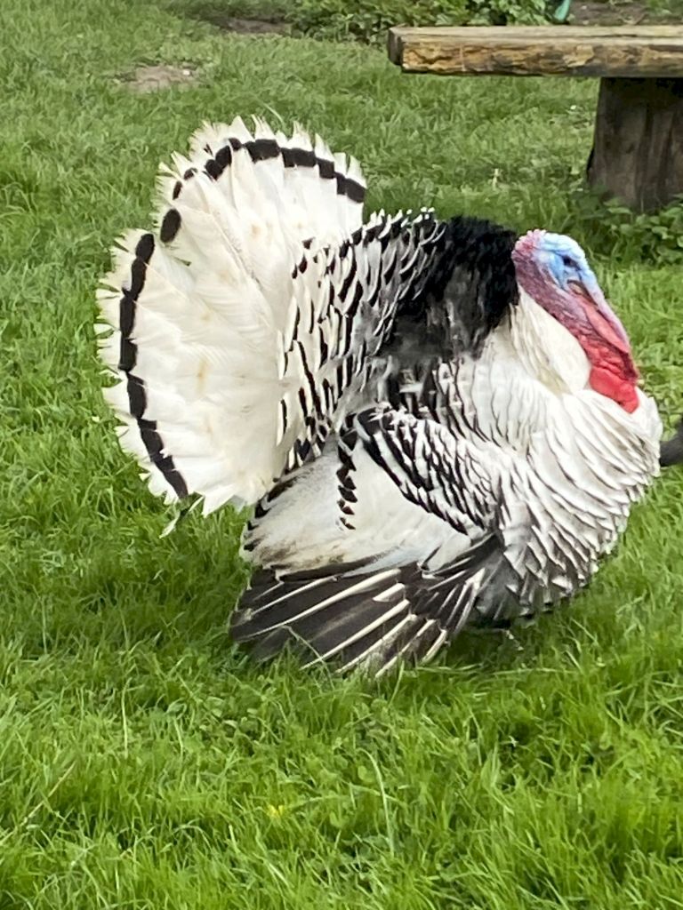 Le soleil se montre enfin en ce début d’après-midi. Nous avons un peu de temps pour faire un petit tour à l’écomusée de la ferme. Nous y voyons les cochons, les chèvres, les dindons et les oies.