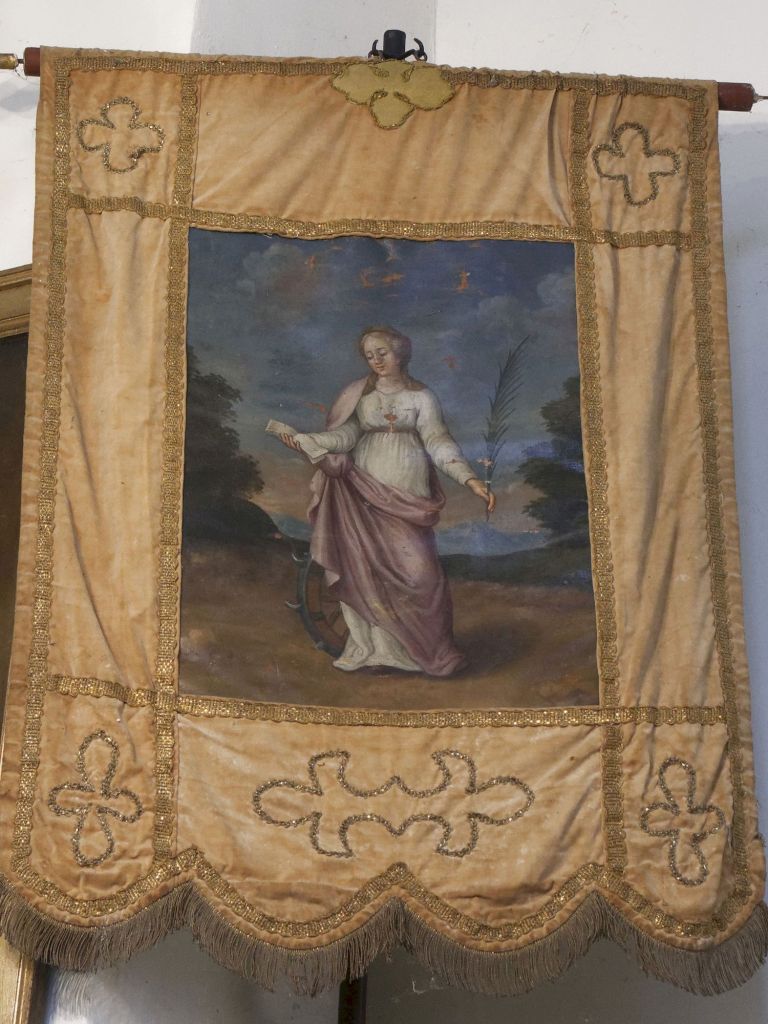 A l’intérieur nous pouvons voir l’amorce de l’escalier qui monte au clocher. A la tribune sont suspendues 5 bannières de procession. Un chappier est exposé.