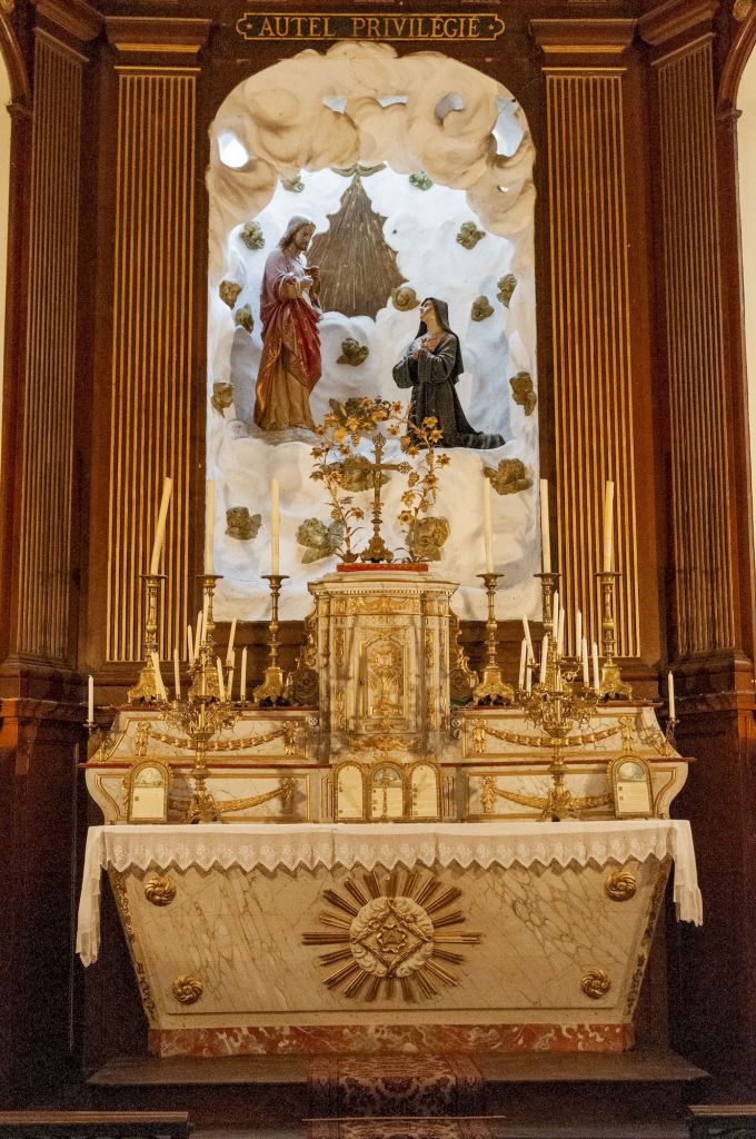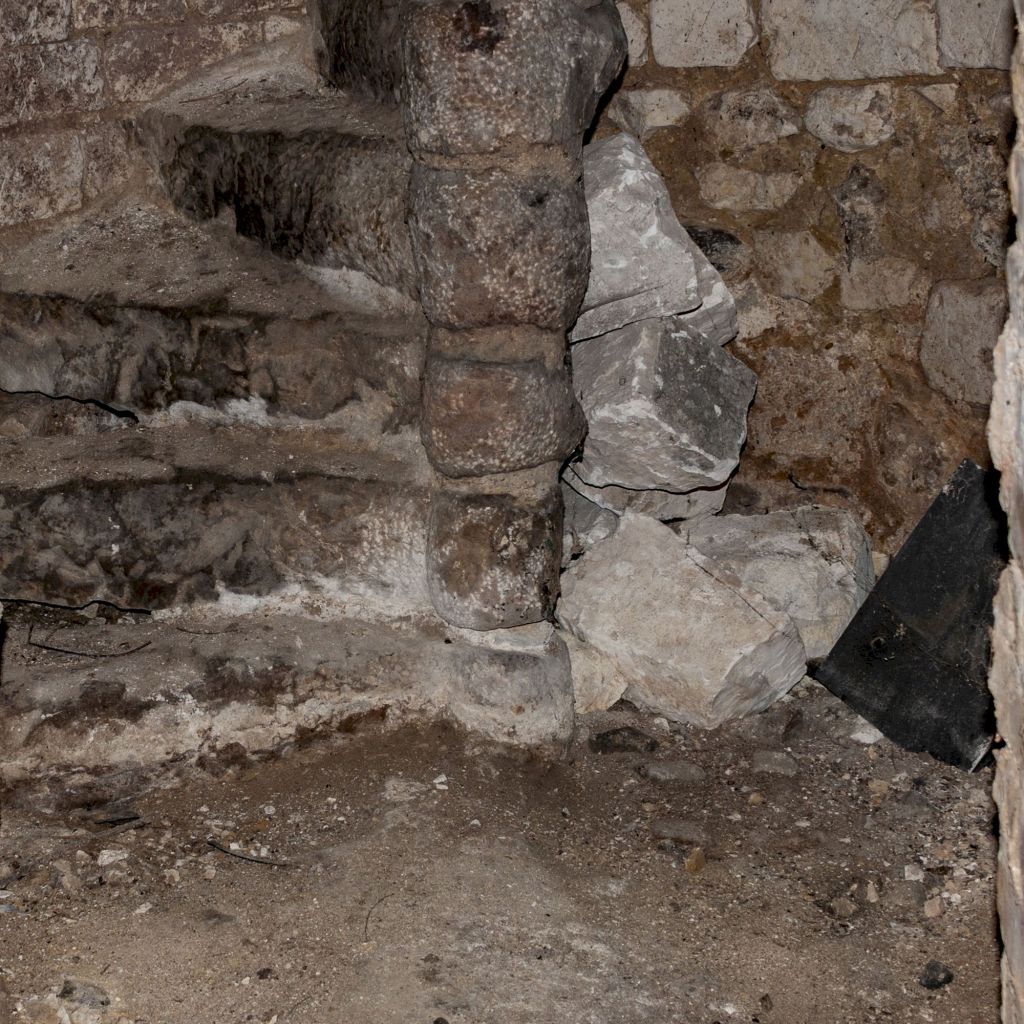 Nous nous dirigeons ensuite vers la chapelle privée qui communique avec l’église. La chapelle permettait aux seigneurs du château d’assister à la messe sans être vus des fidèles. Elle est d’ailleurs plus haute que le sol de l’église.