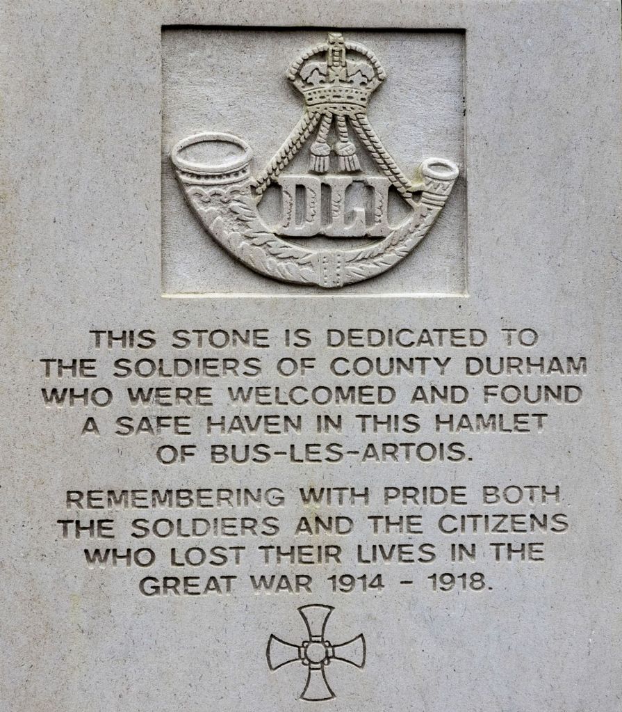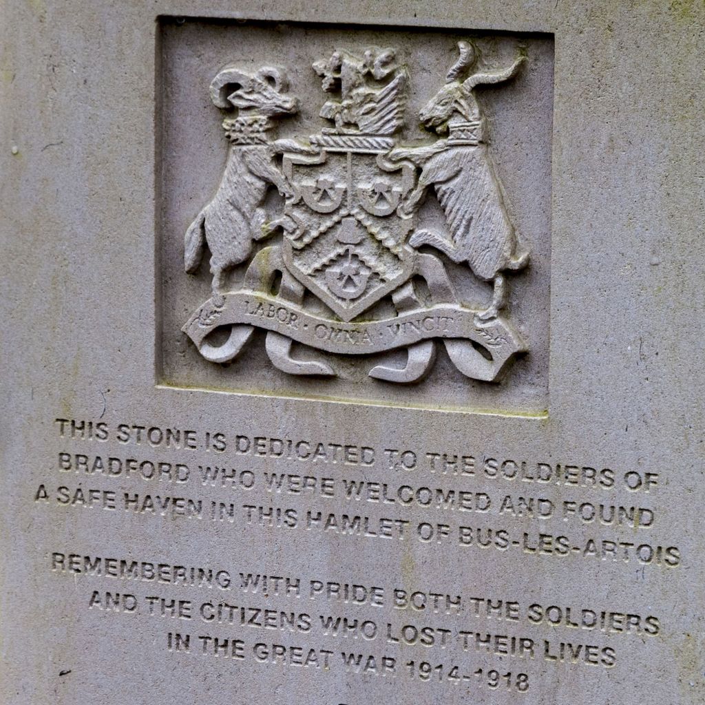 Puis nous redescendons en direction du Monument aux Morts et des stèles érigées par les villes de Bradford, Leeds, dès 2006 et par Durham en 2018, en souvenir des « Pals Battalions » qui y ont séjourné. Ces stèles sont situées à proximité de l’ancien café du village.