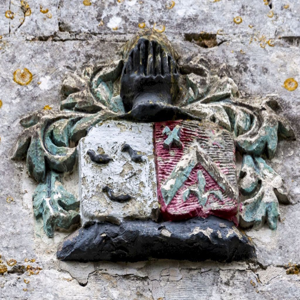 Nous nous dirigeons ensuite vers l’église Saint Pierre. Au-dessus de l’entrée principale de la tour clocher, figurent les armoiries des familles Brunel et Durieux (XVIIe siècle).