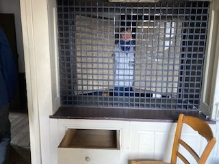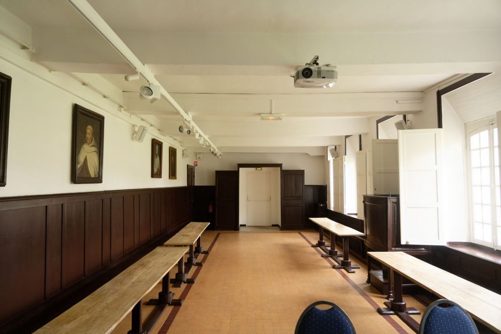 Un escalier mène au 1er étage dans un espace encore public où figurent des décorations et où les fenêtres donnent sur l’extérieur. Nous sommes donc dans un parloir réservé aux communications importantes (naissances, morts, mariages) et aux proches (parents, frères, sœurs) qui doivent en faire la demande motivée auprès de la Prieure, cela avant la réforme de Vatican II.