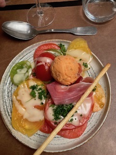Vers 13 heures un déjeuner nous est servi avec Kir accompagné d’une mousse de betteraves, carpaccio de tomates d’antan, jambon de pays et sa glace basilic, suprême de poulet farci aux champignons sauce à la truffe et purée de patates douces, tiramisu aux framboises, café ou thé.