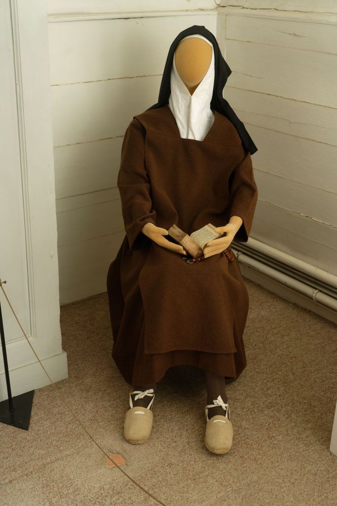 Dans une première cellule, une reconstitution des vêtements et chaussures nous est présentée. Les Carmélites portaient une robe de bure en feutre marron (chaud et peu onéreux) une coiffe blanche couvrant les cheveux et le cou, le tout recouvert d’un voile. Aux pieds des espadrilles blanches et des semelles de bois. Les sœurs portaient pour sortir (jardin etc..) une cape blanche et une noire en supplément.