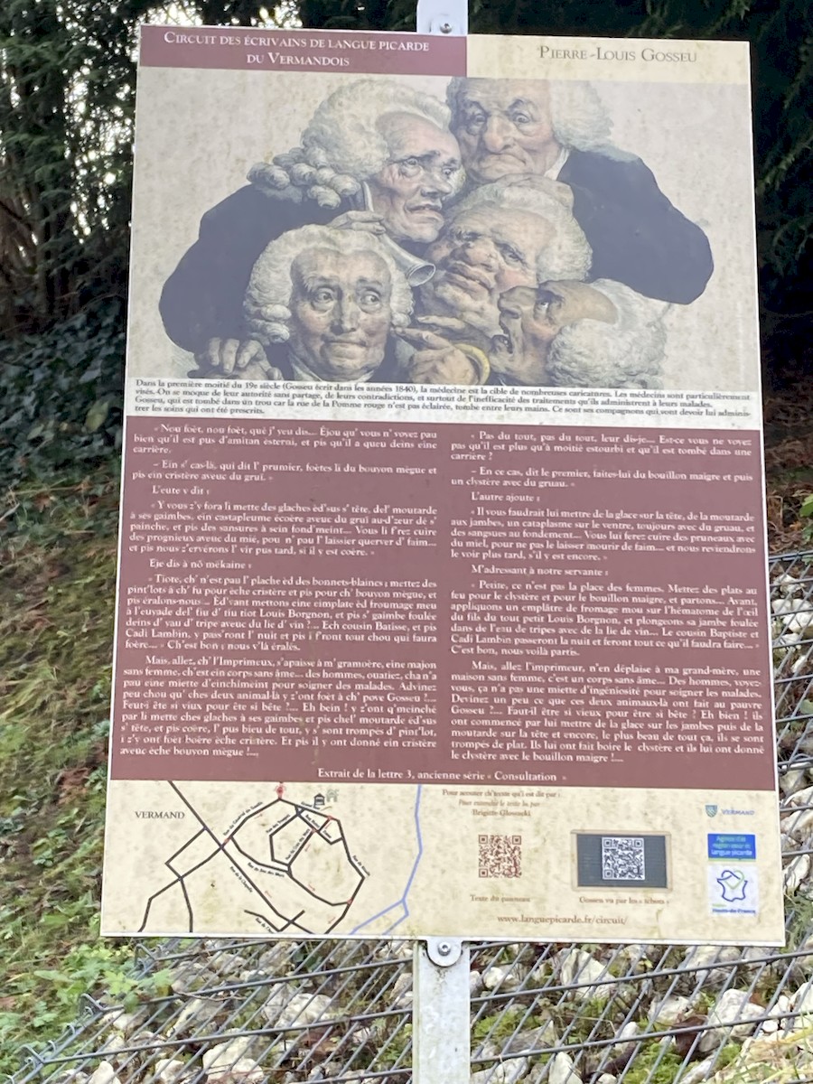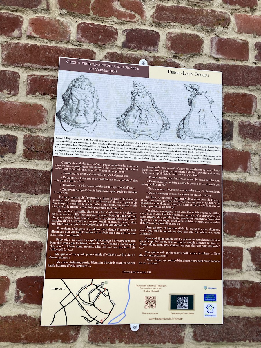 En chemin nous vîmes les plaques apposées en mémoire de Pierre-Louis Gosseu, Pinguet de son vrai nom, (né à Saint-Quentin en 1793 et mort à Paris en 1871), infatigable polémiste, républicain qui publia de 1839 à 1843, dans plusieurs journaux de Saint-Quentin, des Lettres Picardes dans lesquelles il se faisait passer pour un paysan de Vermand venu en ville qui discutait des affaires du royaume de France de l’époque.