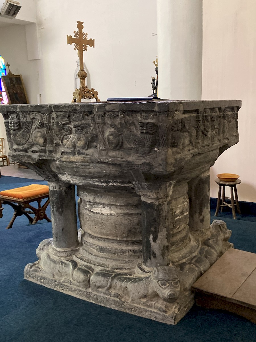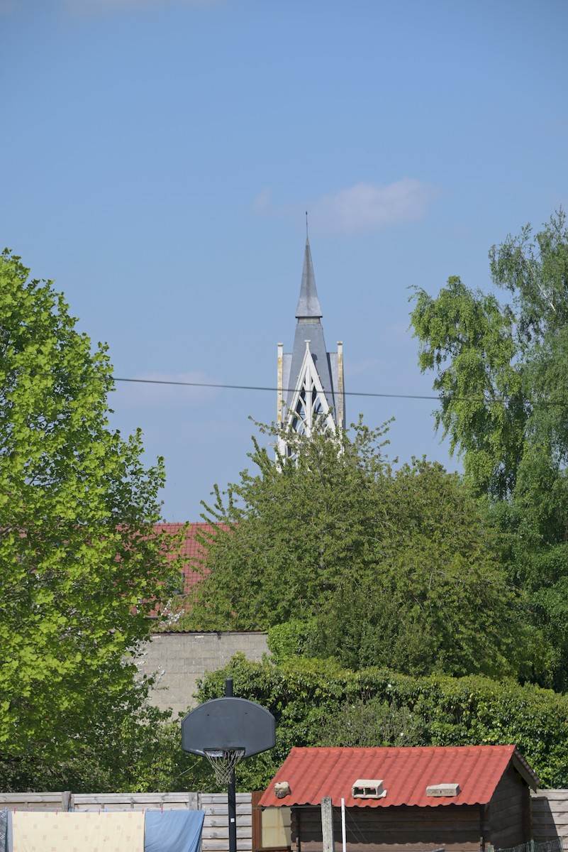 L’église, reconstruite en style Art Déco, a un clocher en béton orné d’une couronne d’épines sur ses faces. Les fonts baptismaux du XIIe siècle en pierre bleue de Tournai ornés de motifs sculptés d’animaux fantastiques, furent ré-installés en 1926 sont. Quatre colonnes supportent la cuve.