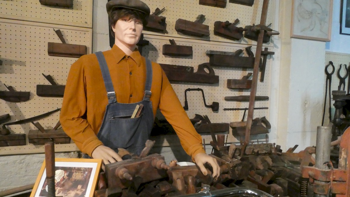 Au sous-sol : vieux métiers et vieux outils. S’y trouvent des lessiveuses, poêle, barattes, un atelier de menuiserie, un de cardage de la laine… mais aussi un télex.