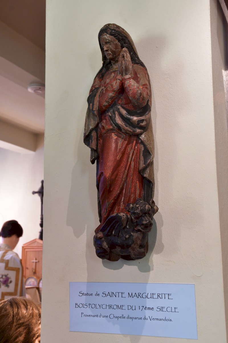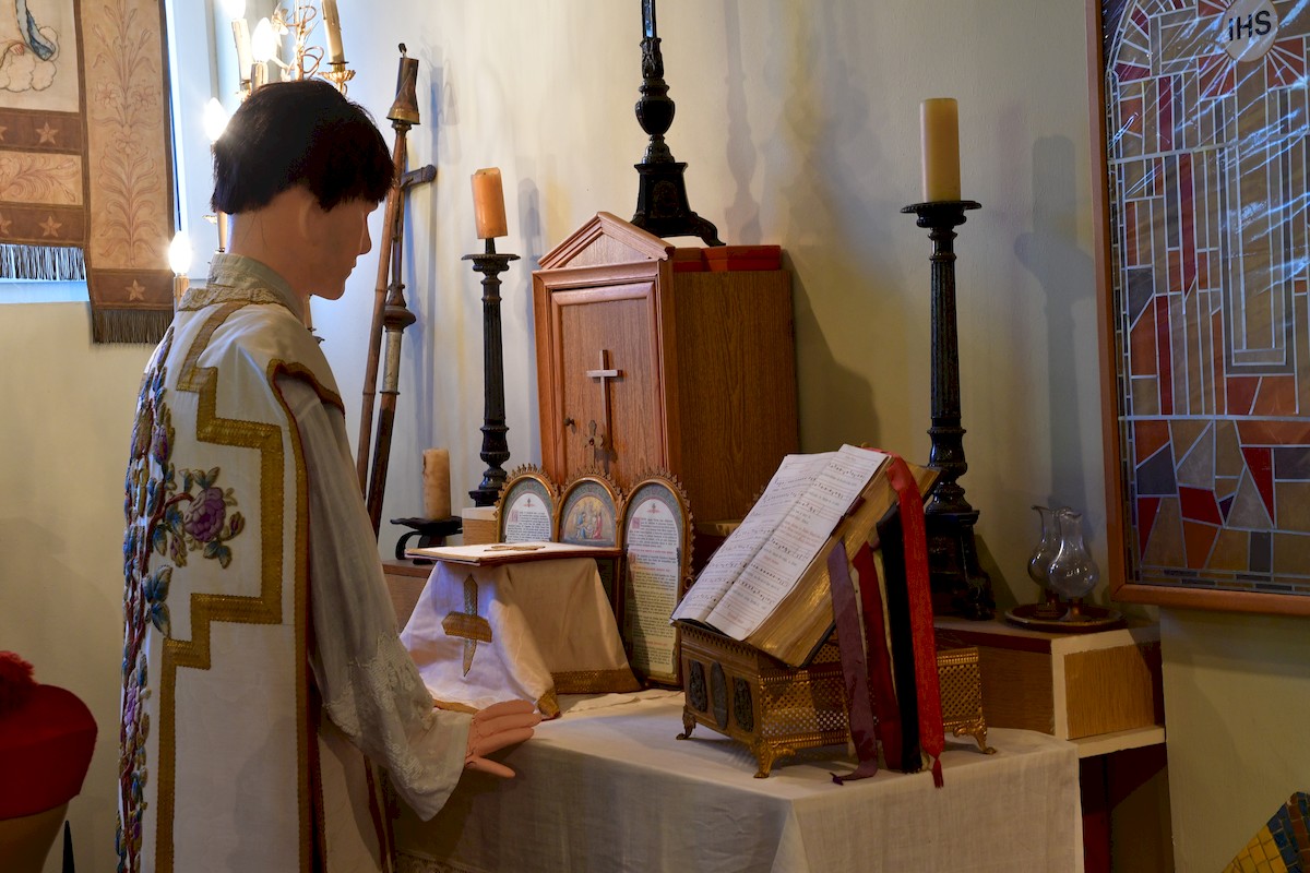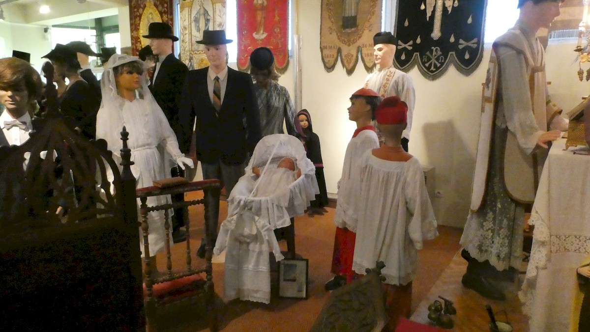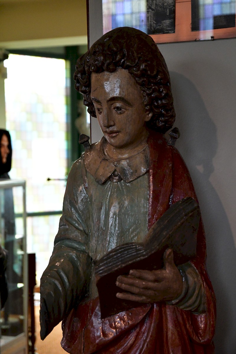 Au premier étage : l’Art religieux, avec les trois grandes religions monothéistes (ornements sacerdotaux ou de lieu de culte, ciboires, scène de baptême) et en particulier la statue de Quintinus en bois polychrome du XVIe siècle.