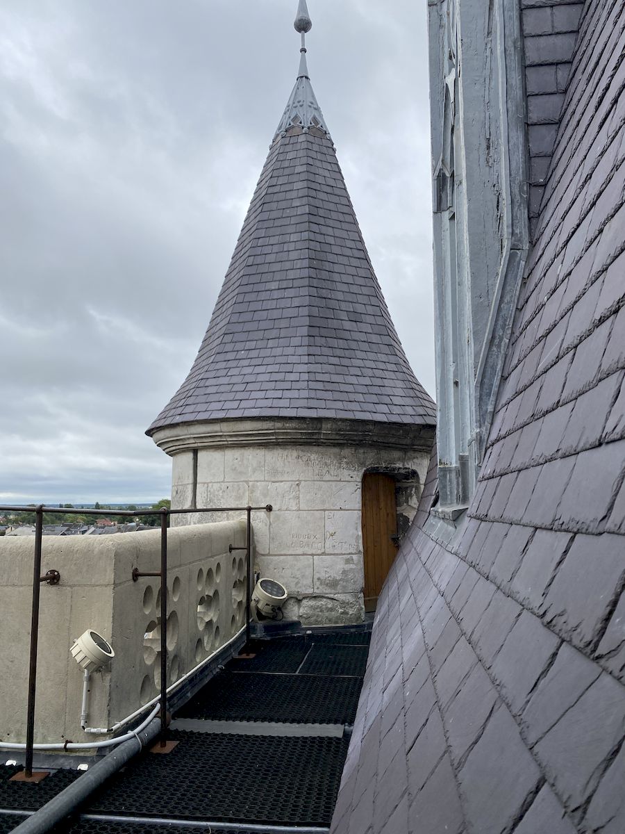 Le chemin de ronde : on y accède par un escalier de pierre, nous apercevons ainsi la toiture en ardoise et bénéficions d’une vue de 360° :