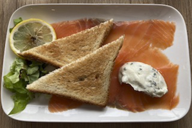 Menu : kir cassis, assiette de saumon fumé, jambon grillé mariné au thym et miel, charlotte aux fruits rouges, vin, café, thé.
