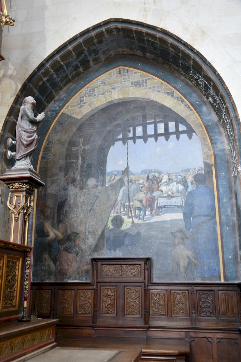 Des toiles ont été marouflées dans les arcades représentant : l’arrivée du crucifix miraculeux à Rue, une représentation (anachronique) de Louis XI en pèlerinage à Rue, et la tentative infructueuse des Abbevillois de s’emparer du crucifix. Se trouvent aussi la main droite du Crucifix en bois ainsi qu’un bas relief représentant la barque à fond plat apportant le Crucifix en bois.