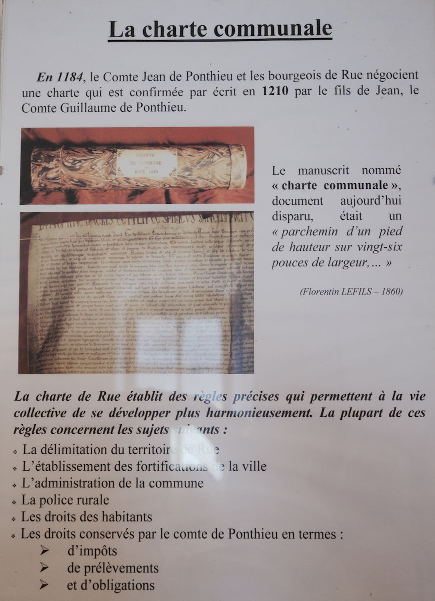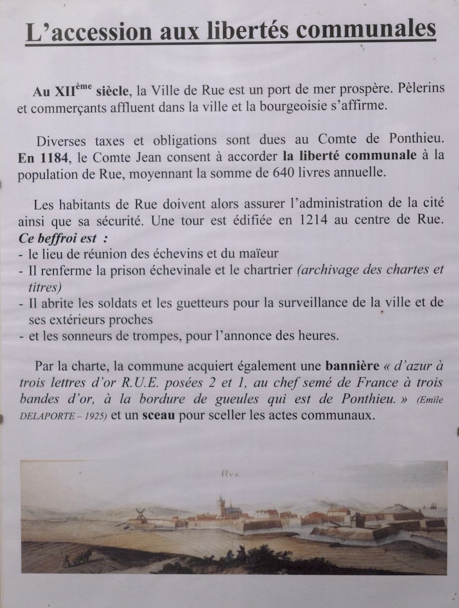 Les habitants de Rue devaient alors assurer l’administration de la cité ainsi que sa sécurité. Une tour fut édifiée en 1214 au centre de Rue.