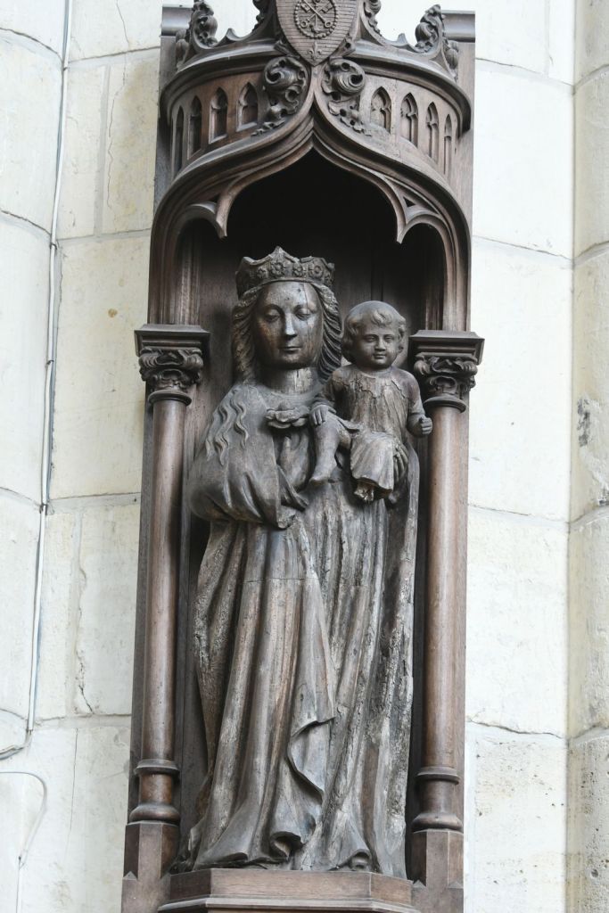 Une statue dite Vierge à la chaise a été dorée par erreur. Sur le bas-côté droit, se trouve l’autel des femmes (œuvre de Duthoit) : avec Sainte Claire, Saint Nicolas. Sainte Colette est représentée en gloire avec des angelots, On vient la prier pour avoir des enfants.