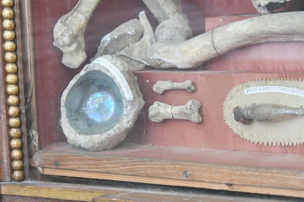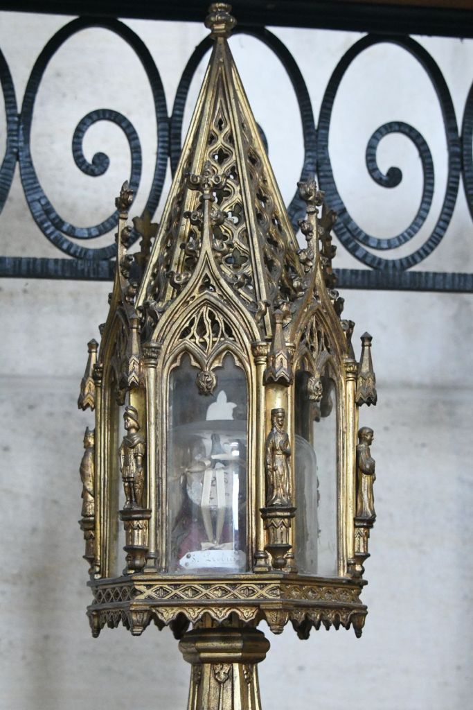 Trois reliquaires sont accrochés à droite de l’autel : l’un contenant un morceau du manteau de Sainte Colette, un autre des restes de Sainte Martine, un autre des os de Saint Adalard.