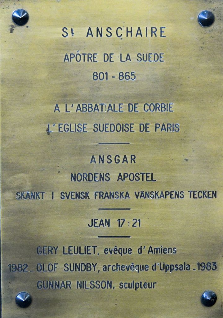 Une statue contemporaine d’Anschaire (Oscar) qui évangélisa l’Allemagne du Nord (Brême) le Danemark (deux contrées où il est encore connu) et une partie de la Suède (où son influence a disparu) figure au dessus d’un photographie de l’abbatiale de Corvey (la nouvelle Corbie).