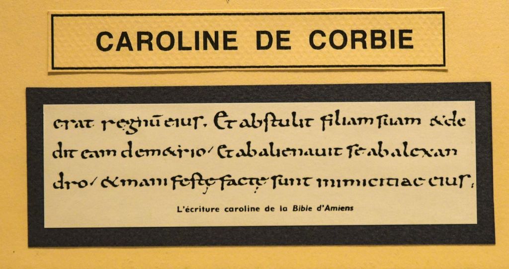 La caroline : Charlemagne tenait à unifier son royaume, le latin fut utilisé pour une compréhension dans tout l’empire et les moines de Corbie mirent au point une écriture la « Caroline » qui rendit plus lisibles les textes par les lettres plus simples, des mots séparés par des espaces et des phrases par la ponctuation. La police « Times New Roman » de nos traitements de texte s’en inspire, Corbie est le centre pivot pour cette écriture. Alcuin (abbé de Tours en 796) a offert à Charlemagne une Bible de Maurdramne entièrement écrite en lettres carolines.
