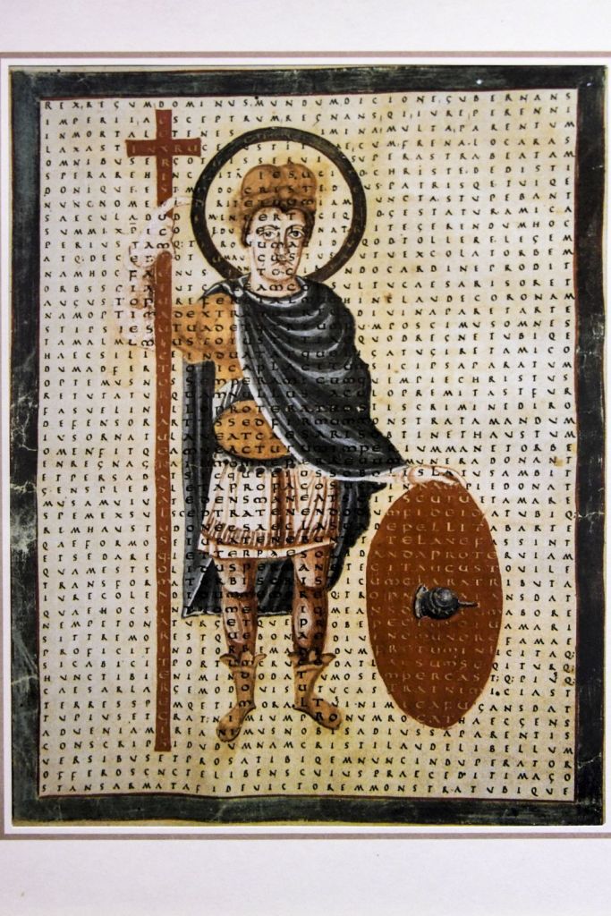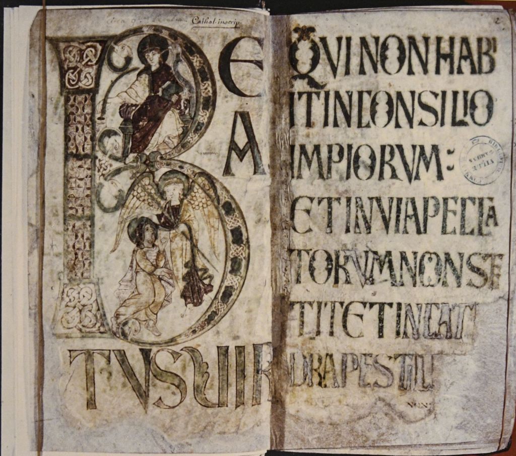 Un exemple de manuscrit, le Psautier de Corbie : Beatus … la majuscule B représente le roi David et un ange, le O représente la terre (à l’époque on pensait qu’elle était plate), la majuscule C représente un oiseau qui se tord le cou pour pouvoir se gratter la tête avec la patte. On retrouve aussi des entrelacs de 7 cm rappelant l’Irlande dont les moines s’étaient établis à Luxeuil et dont certains étaient venus fonder l’abbaye de Corbie.