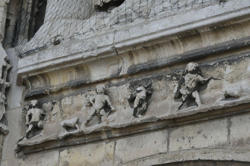 Sous le tympan, un bandeau Renaissance comporte des angelots et une chasse avec au centre un cerf et des chiens. François 1er était grand chasseur.