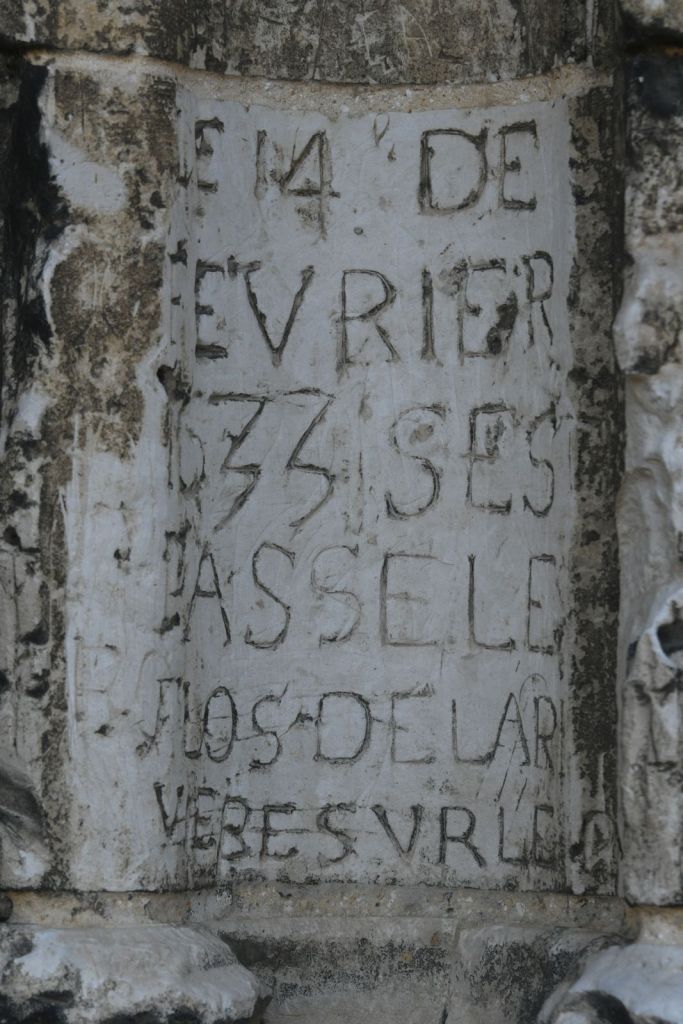 On y retrouve la salamandre de François 1er, qui venait souvent dans la région voir Anne de Pisseleu (1508-1580) sa favorite. A gauche Saint Pierre et une statue de la donatrice. Il manque Saint François et Saint Jean. Entre les deux portes il devait y avoir une statue de la Vierge Marie assise ou un Christ de pitié, à droite une statue de Saint Antoine et de Saint Jacques (on est sur le chemin du pèlerinage de Saint Jacques). A l’extrémité droite un Christ de pitié de 1525, le plus beau.