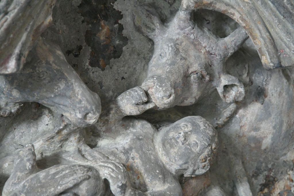 Un rat ajouté par Viollet le Duc se trouve derrière la tête du Christ, à droite.