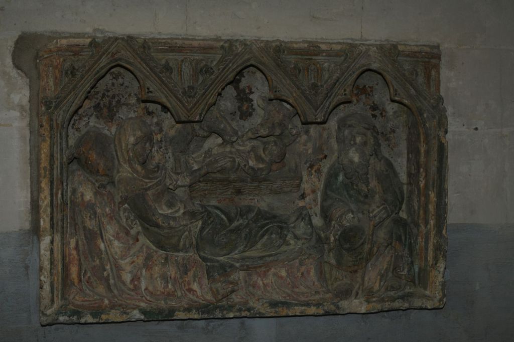 Le retable de La Nativité du XIVe siècle (œuvre Classée MH) présente une scène familière avec la Vierge allongée à l’orientale, comme dans une dormition. Jésus qui apparaît grand met le doigt dans la bouche du bœuf. Saint joseph en berger à droite. Des traces de polychromie restent visibles.