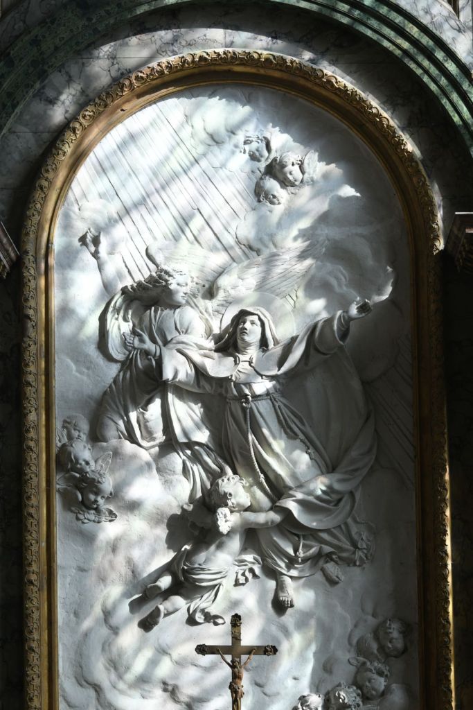 A gauche de l’autel central, on trouve l’autel des hommes avec Saint Benoît et Saint Antoine l’ermite, Saint François et Saint Roch accompagné de son chien.