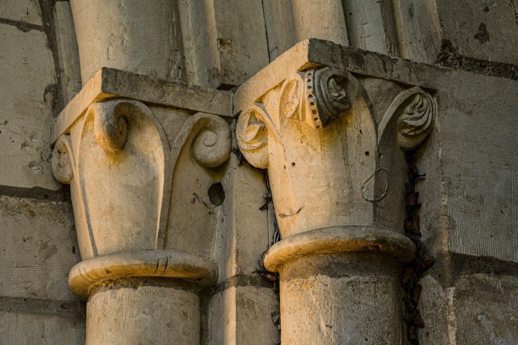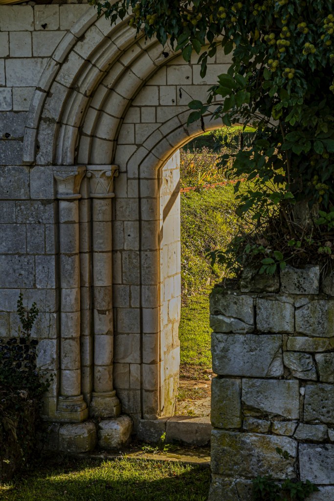 A l’entrée Ouest de l’église, ont été restaurés un portail roman avec arc en plein cintre retombant sur deux colonnes qui comportent des chapiteaux sculptés et la griffe de Fontevraud. Un narthex devait précéder cette entrée, pour les visiteurs qui pénétraient par la ferme, entrée de l’Abbaye. A côté se trouvait probablement un clocher du XIIIe siècle et un parloir.