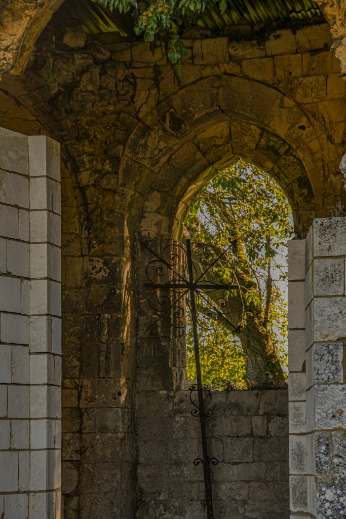 La chapelle attenante comprend une croix en fer forgé. Les nervures de la voûte entrent dans le pilier et signent une architecture de la fin du XVe siècle.