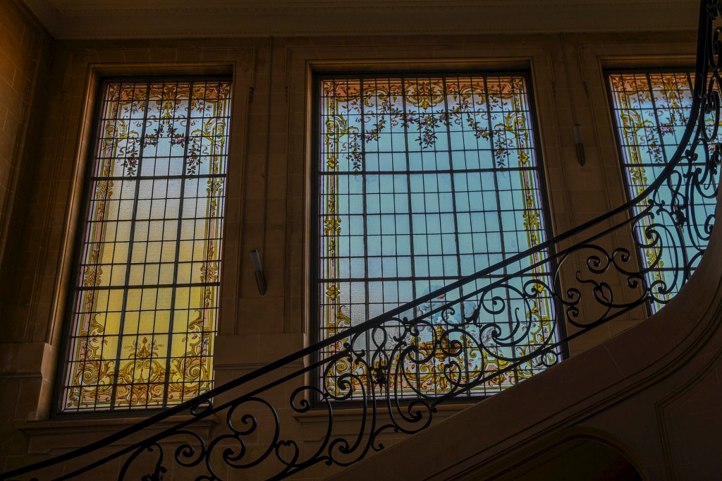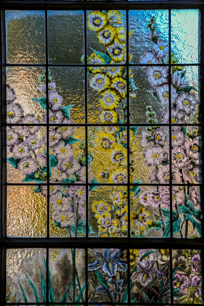 Au second, les vitraux « Art Nouveau » (style alors adopté par la classe moyenne) ont été restaurés par les ateliers Claude Barre, sans indication du maître verrier (Ventillard ?). Il s’agit là d’une cuisson couleur par couleur avec des températures différenciées. Sont représentées deux rives qui s’opposent, à droite roses trémières, à gauche exotisme (oiseaux, libellules). La brume est représentée sur le plan d’eau central (tendance 1900). Cette pièce, dont on ignore l’usage, regarde vers le Nord (vers le château rouge). La tendance décorative est celle de Maurice DENIS.